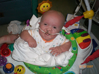 Caleb's Physical and Occupational Therapists, as well as his docs, are very encouraged with his developmental progress. He is doing great with 'cause' and 'effect' exercises too!!! He is fighting along. I know that sometimes these items that I post regarding developmental milestones seem like normal things for an every day child, but Caleb has CHARGE syndrome which can make some minor milestones seem so significant. From the CHARGE syndrome foundation website 'Babies with CHARGE syndrome are often born with life-threatening birth defects, including complex heart defects and breathing problems. They spend many months in the hospital and undergo many surgeries and other treatments. Swallowing and breathing problems make life difficult even when they come home. Most have hearing loss, vision loss, and balance problems which delay their development and communication. All are likely to require medical and educational intervention for many years. Despite these seemingly insurmountable obstacles, children with CHARGE syndrome often far surpass their medical, physical, educational, and social expectations.' Thefore, you can see why sometimes what others see as the 'little things' are no so little to us.